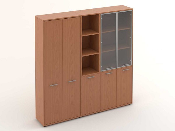 Комплект офісних шаф Техно-k16 з гардеробом зробить ваш офіс виразним і стильним. Комплект складається з шафи для документів, пеналу і гардеробу. Фасад шафи для документів комбінований: зверху тоноване сіре скло в алюмінієвому профілі італійського виробництва "Metal Stampi", знизу - дверцята з ДСП. Пенал знизу має 2 полиці під фасадом і 3 відкриті полички зверху. Гардероб оснащений полицею для головних уборів і мікроліфтом. Задня стінка шаф виготовляється з ДСП товщиною 18 мм.